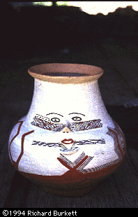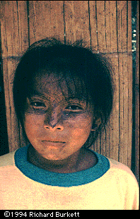 A young girl in Sarayacu shows a good example of the beautiful facial painting. This is done with a vegetable dye using brushes like those used for decorating the pottery. The painting is not permanent and must be redone every few weeks.